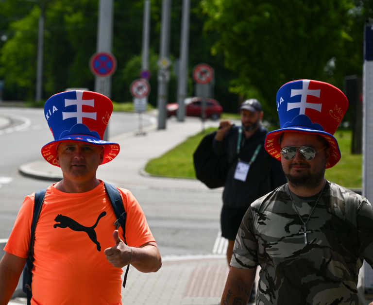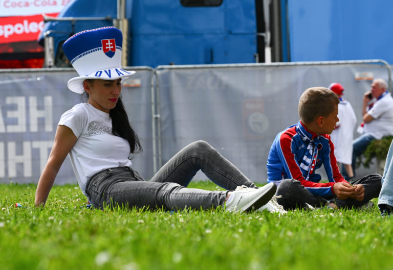 Slovenskí fanúšikovia pred hokejovou Ostravar arénou pred zápasom Slovensko - Nemecko základnej B-skupiny majstrovstiev sveta v ľadovom hokeji 2024 v Českej republike. Ostrava, Česká republika, 10. máj 2024. Foto: SITA/Martin Medňanský.