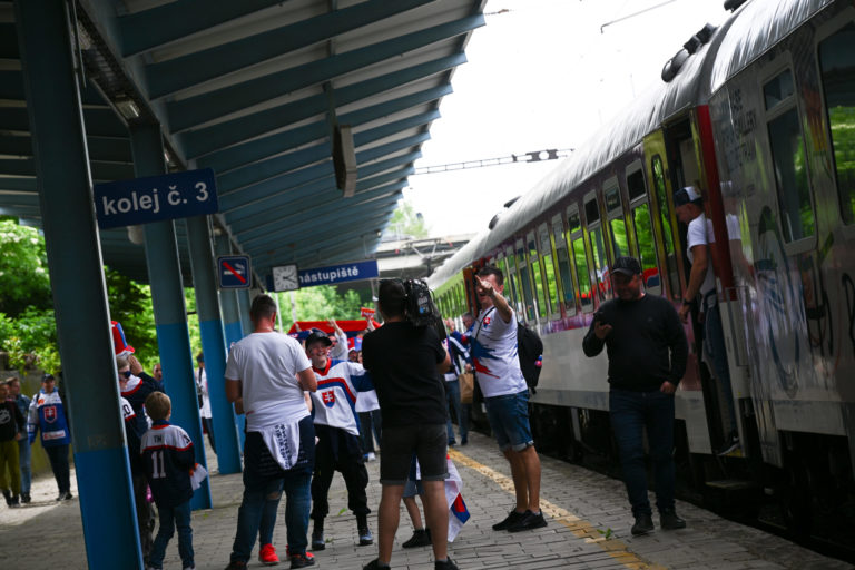 Príchod slovenských fanúšikov vlakom Národného dopravcu Železičnej spoločnosti Slovensko (ZSSK) IDeme vlakom na majstrovstvá sveta v hokeji na železničnú stanicu Ostrava-Vítkovice pred zápasom Slovensko - Nemecko základnej B-skupiny majstrovstiev sveta v ľadovom hokeji 2024 v Českej republike. Ostrava, Česká republika, 10. máj 2024. Foto: SITA/Martin Medňanský.