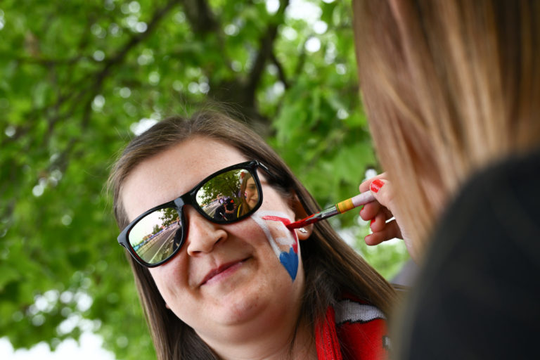 Slovenská fanúšička pred hokejovou Ostravar arénou pred zápasom Slovensko - Nemecko základnej B-skupiny majstrovstiev sveta v ľadovom hokeji 2024 v Českej republike. Ostrava, Česká republika, 10. máj 2024. Foto: SITA/Martin Medňanský.