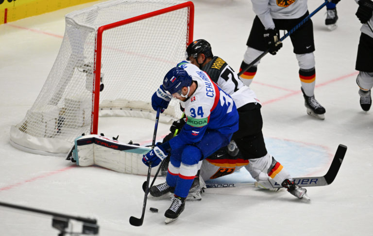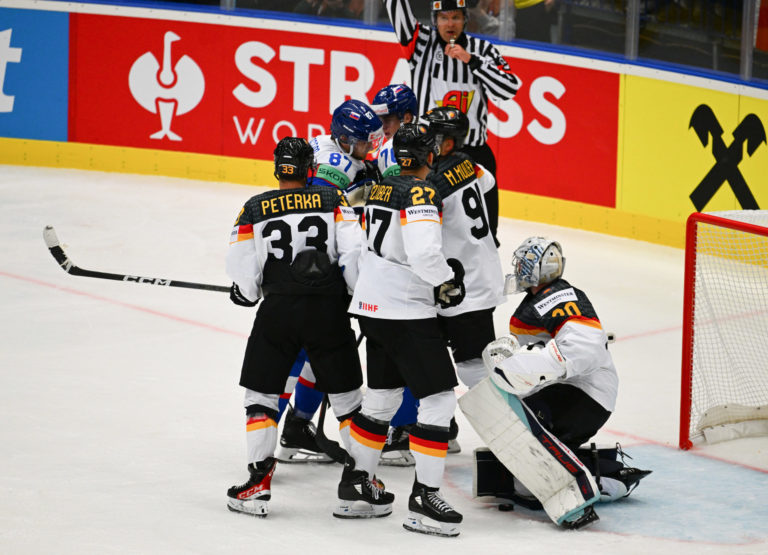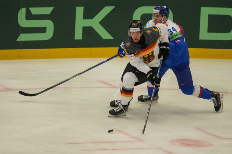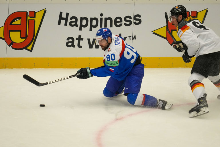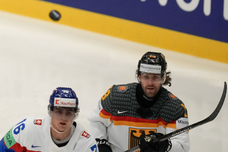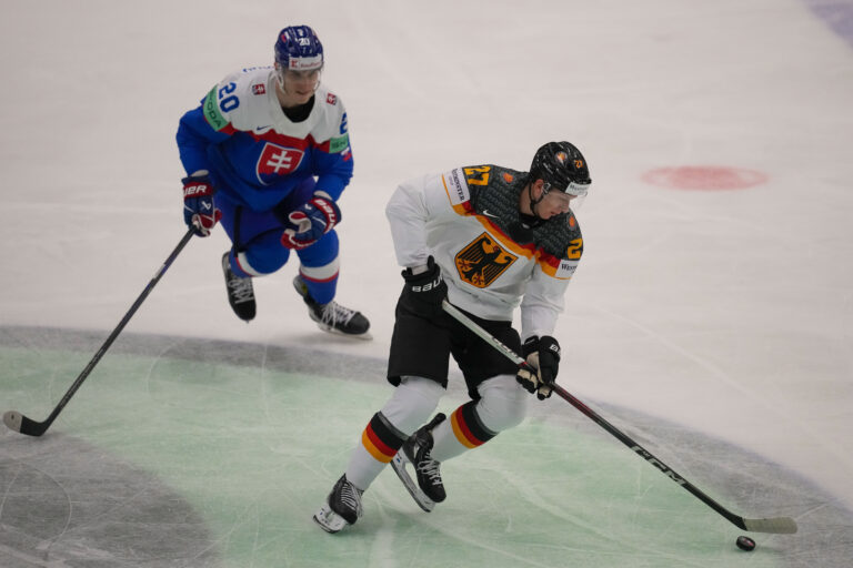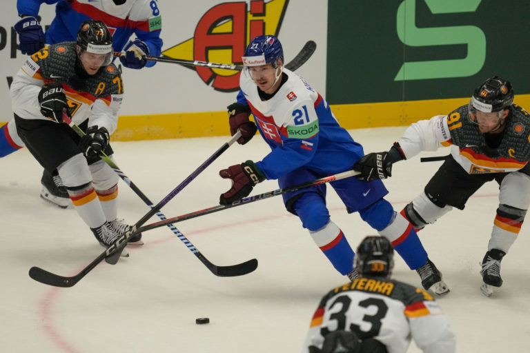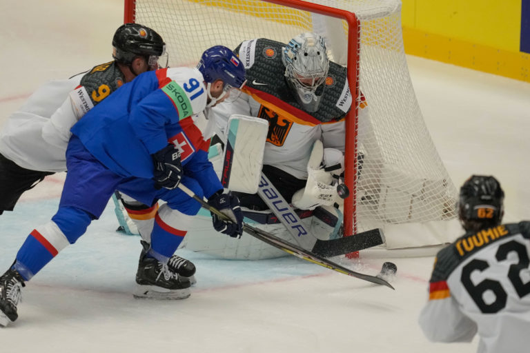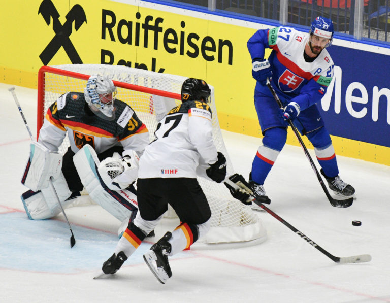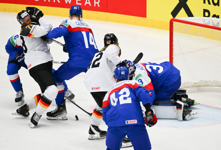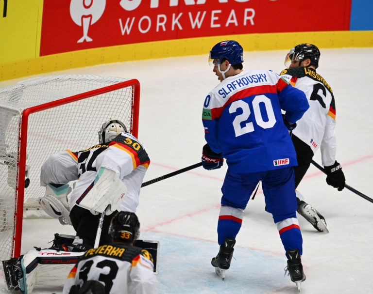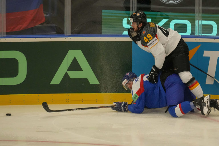 Šanca Nemecka v úvode prvej tretiny počas zápasu proti Slovensku v základnej B-skupine na MS v hokeji 2024. Ostrava (Ostravar Aréna), 10. máj 2024. Foto: SITA/AP.