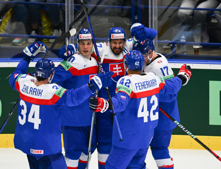 Radosť hokejistov zo Slovenska počas zápasu Slovensko - Nemecko základnej B-skupiny majstrovstiev sveta v ľadovom hokeji 2024 v Českej republike. Ostrava, Česká republika, 10. máj 2024. Foto: SITA/Martin Medňanský