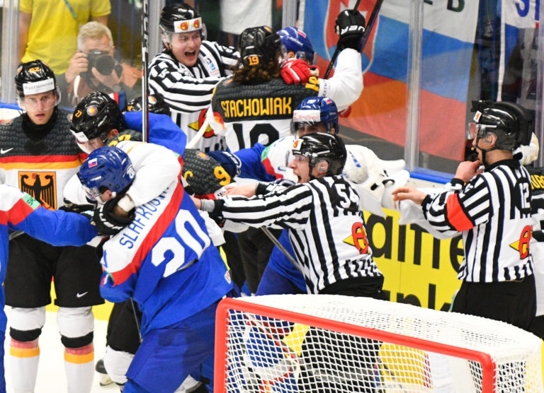 Šarvátka počas zápasu Slovensko - Nemecko základnej B-skupiny na MS v hokeji 2024. Ostrava (Ostravar aréna(, 10. máj 2024. Foto: SITA/Martin Medňanský