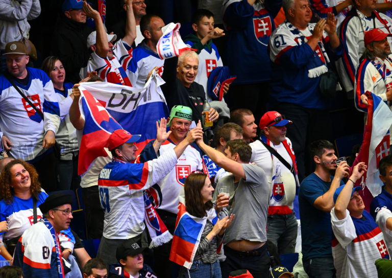 Slovenskí fanúšikovia počas zápasu Slovensko - Nemecko základnej B-skupiny majstrovstiev sveta v ľadovom hokeji 2024 v Českej republike. Ostrava, Česká republika, 10. máj 2024. Foto: SITA/Martin Medňanský