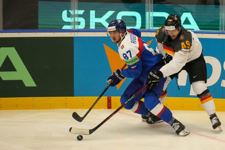 Zľava: Peter Cehlárik zo Slovenska a Dominik Kahun z Nemecka počas zápasu Slovensko - Nemecko základnej B-skupiny majstrovstiev sveta v ľadovom hokeji 2024 v Českej republike. Ostrava, Česká republika, 10. máj 2024. Foto: SITA/Martin Medňanský
