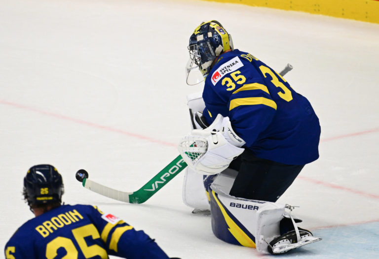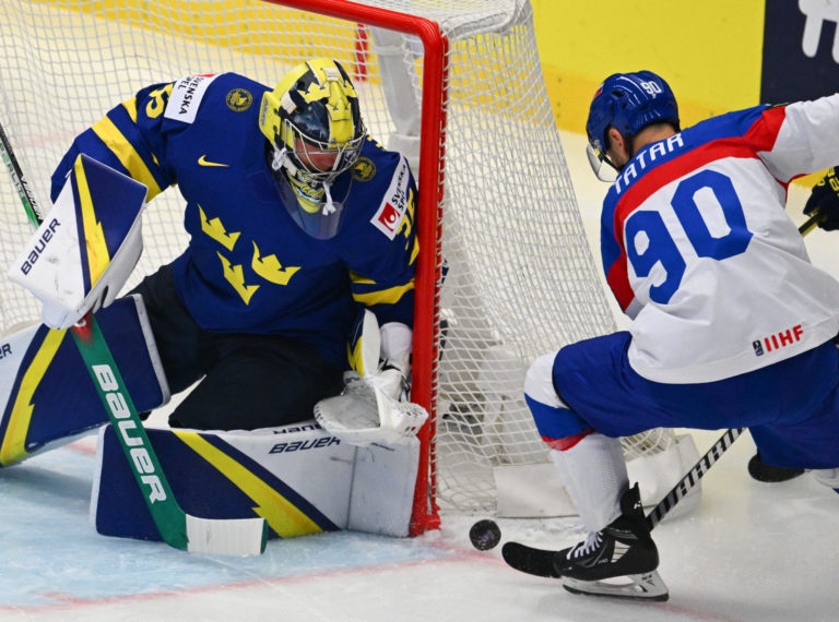 Zákrok švédskeho gólmana Filipa Gustavssona počas zápasu proti Slovensku v základnej B-skupine na MS v hokeji 2024. Ostrava (Ostravar Aréna), 21. máj 2024. Foto: SITA/Martin Meňanský.
