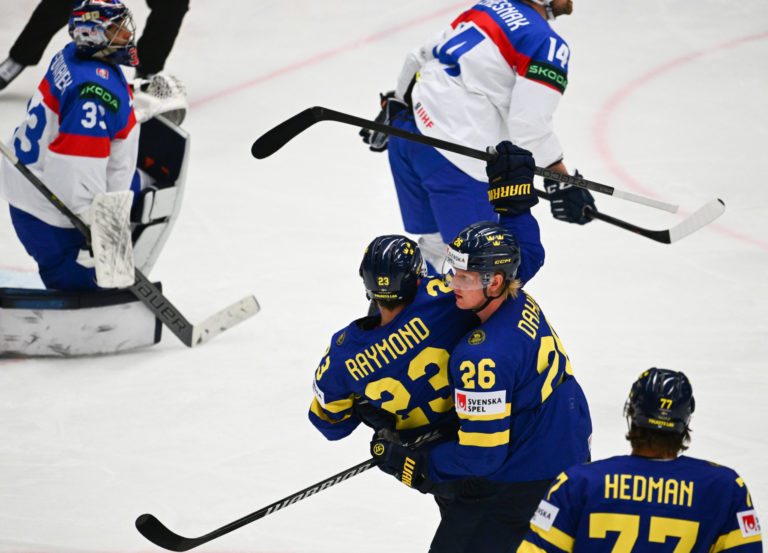 Švédsky útočník Lucas Raymond sa so spoluhráčmi teší zo svojho gólu v sieti Slovenska v zápase základnej B-skupiny na MS v hokeji 2024 Ostrava (Ostravar Aréna), 21. máj 2024. Foto: SITA/Martin Medňanský.