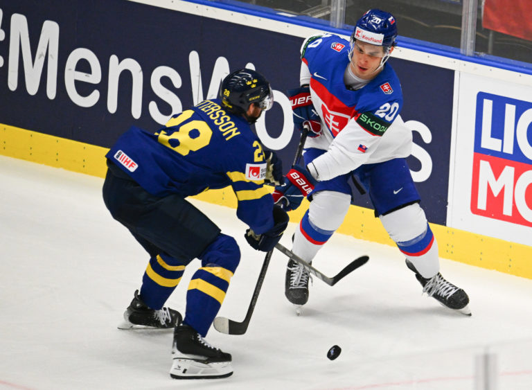 Slovenský útočník Juraj Slafkovský a Švéd Marcus Pettersson počas zápasu základnej B-skupiny na MS v hokeji 2024. Ostrava (Ostravar Aréna), 21. máj 2024. Foto: SITA/Martin Meňanský.