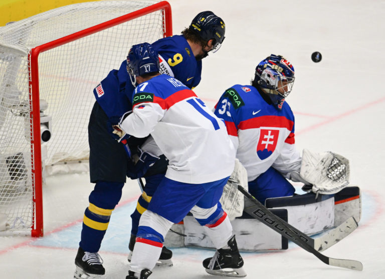 Slovenský obranca Šimon Nemec v súboji so švédskym útočníkom Adrianom Kempem pred brankárom Stanislavom Škovránkom počas zápasu základnej B-skupiny na MS v hokeji 2024. Ostrava (Ostravar Aréna), 21. máj 2024. Foto: SITA/Martin Meňanský.