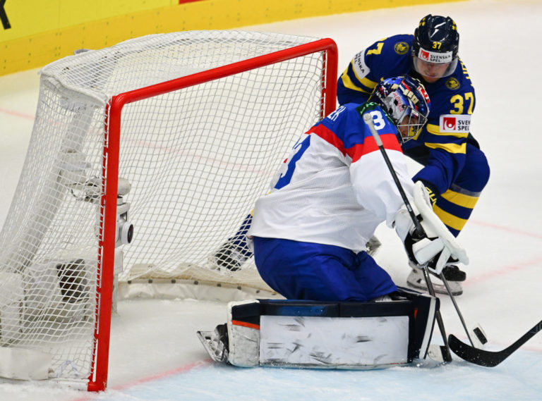 Slovenský brankár Stanislav Škorvánek dostáva prvý gól v zápase proti Švédsku v základnej B-skupine na MS v hokeji 2024. Ostrava (Ostravar Aréna), 21. máj 2024. Foto: SITA/Martin Medňanský.