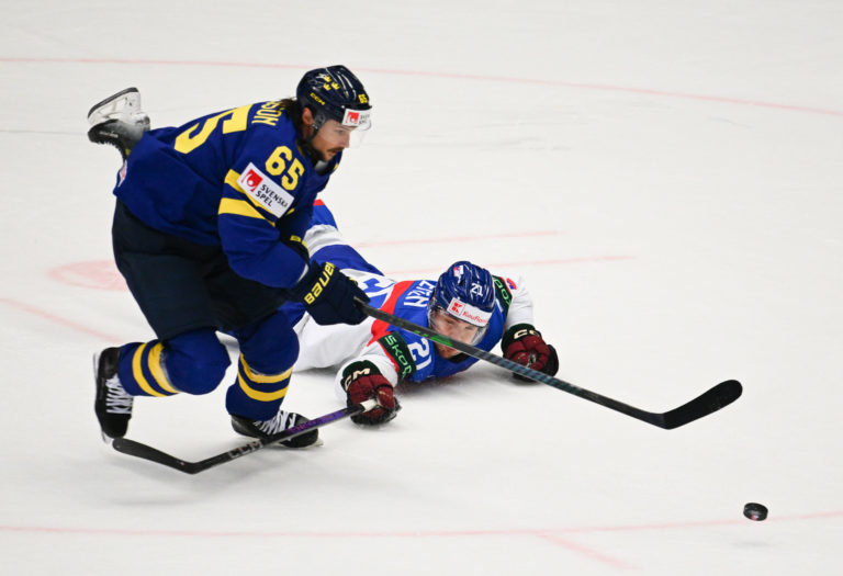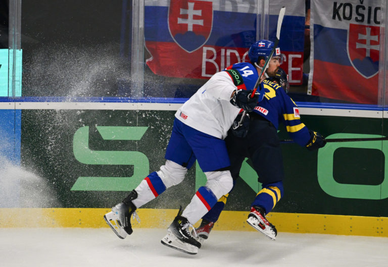 Slovenský obranca Martin Fehérváry padá po súboji so Švédom Rasmusom Dahlinom počas zápasu základnej B-skupiny na MS v hokeji 2024. Ostrava (Ostravar Aréna), 21. máj 2024. Foto: SITA/Martin Meňanský.