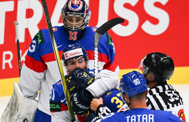 Potýčka v zápase medzi Švédskom a Slovenskom v základnej B-skupine na MS v hokeji 2024. Ostrava (Ostravar Arénaň, 21. máj 2024. Foto: SITA/Martin Meňanský.