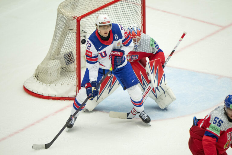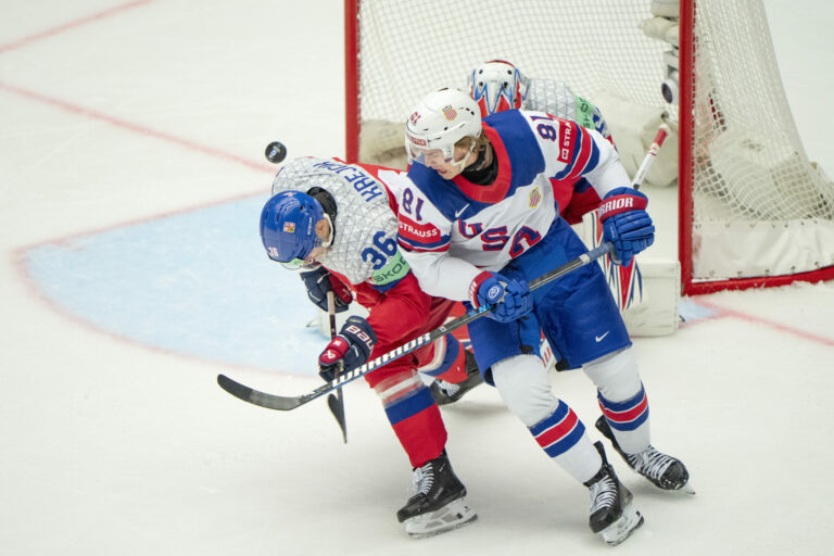Logan Cooley z tímu USA (vpravo), tiesnený Jakubom Krejčíkom z Česka, sa snaží doraziť puk do bránky súpera počas zápasu základnej B-skupiny na MS v hokeji 2025. Herning (Jyske Bank Boxen), 20. máj 2025. Foto: Bo Amstrup/Ritzau Scanpix via AP