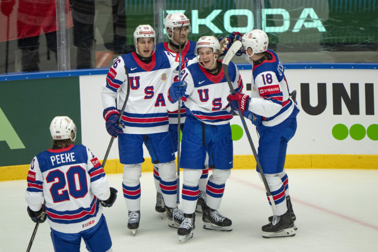 Hráči USA oslavujú gól proti Česku počas zápasu základnej B-skupiny na MS v hokeji 2025. Herning (Jyske Bank Boxen), 20. máj 2025. Foto: Bo Amstrup/Ritzau Scanpix via AP