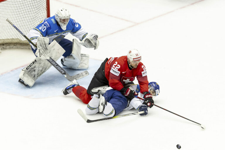 Švajčiar Nino Niederreiter v súboji s Alichanom Omirbekovom pred brankárom Maximom Pavlenkom počas zápasu základnej B-skupiny na MS v hokeji 2025. Herning (Jyske Bank Boxen), 20. máj 2025. Foto: Salvatore Di Nolfi/Keystone via AP.