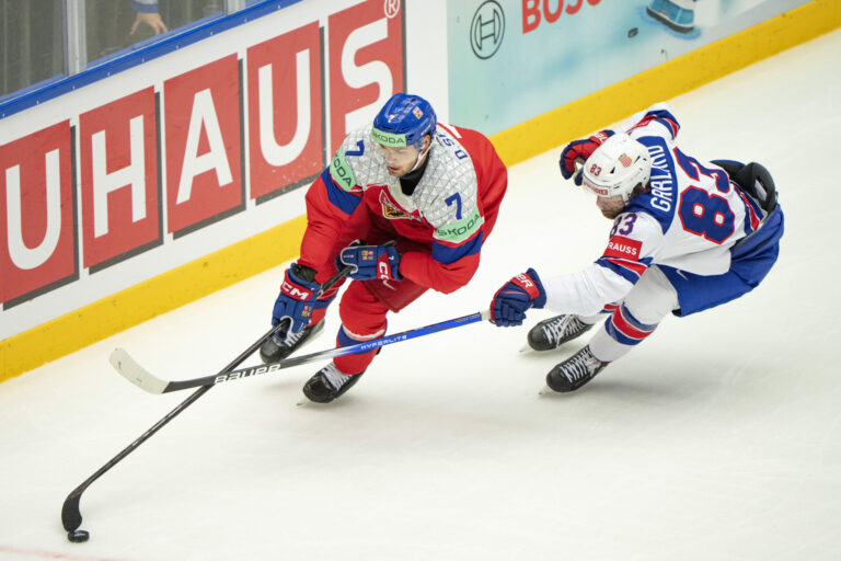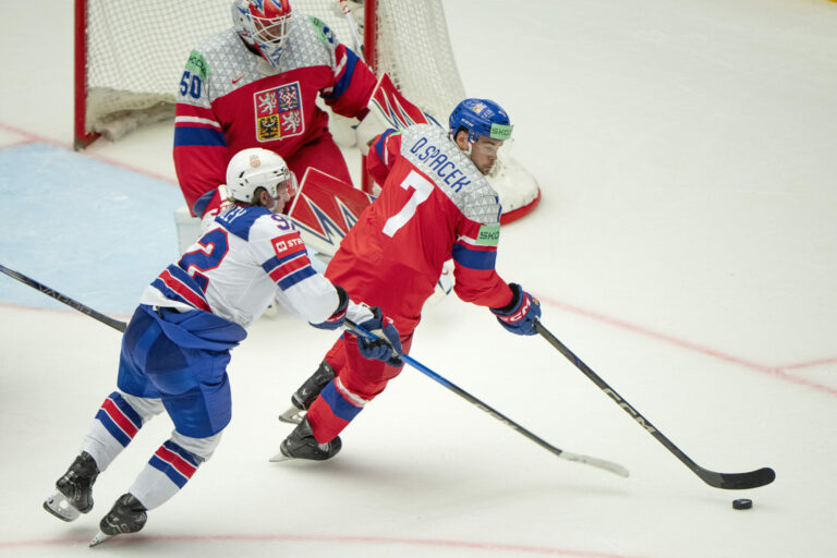 David Špaček z Česka (vľavo) uniká Conorovi Garlandovi z USA počas zápasu základnej B-skupiny na MS v hokeji 2025. Herning (Jyske Bank Boxen), 20. máj 2025. Foto: Bo Amstrup/Ritzau Scanpix via AP
