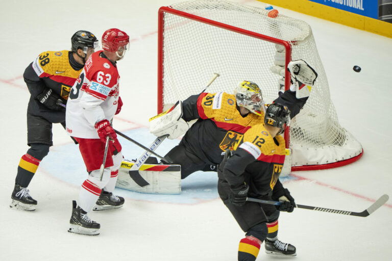 Zákrok nemeckého brankára Philippa Grubauera v zápase proti Dánsku v základnej B-skupine na MS v hokeji 2025. Herning (Jyske Bank Boxen), 20. máj 2025. Foto: Bo Amstrup/Ritzau Scanpix via AP.