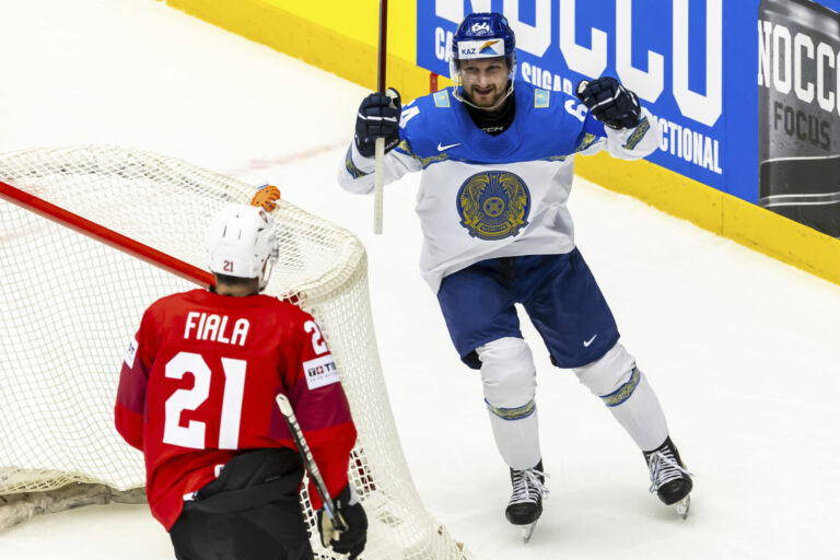 Kazašský útočník Arkadiy Šestakov sa teší z gólu na 1:0 v zápase proti Švajčiarsku v základnej B-skupine na MS v hokeji 2025. Herning (Jyske Bank Boxen), 20. máj 2025. Foto: Salvatore Di Nolfi/Keystone via AP.
