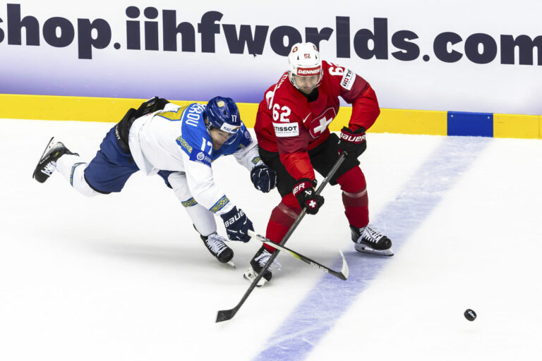 Kazach Alichan Omirbekov v súboji so švajčiarskym útočníkom Denisom Malginom počas zápasu základnej B-skupiny na MS v hokeji 2025. Herning (Jyske Bank Boxen), 20. máj 2025. Foto: Salvatore Di Nolfi/Keystone via AP.