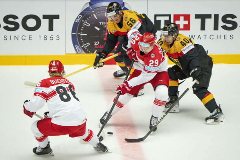 Nemecký útočník Manuel Wiederer (56) sleduje súboj svojho spoluhráča Alexandra Ehla (40) s Dánmi Mikkelom Aagaard (29) a Joachimom Blichfeldom (86) počas zápasu základnej B-skupiny na MS v hokeji 2025. Herning (Jyske Bank Boxen), 20. máj 2025. Foto: Bo Amstrup/Ritzau Scanpix via AP.