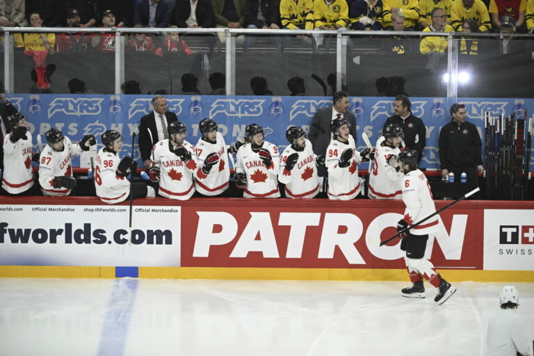 Kanadský obranca Travis Sanheim sa so spoluhráčmi teší zo svojho gólu v 18. sekunde zápasu proti Švédsku v základnej A-skupine na MS v hokeji 2025. Štokholm (Avicii Arena), 20. máj 2025. Foto: Fredrik Sandberg/TT via AP.