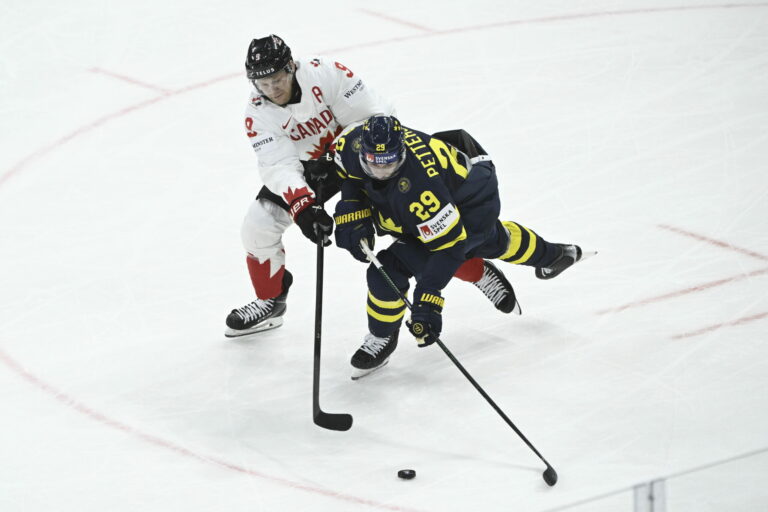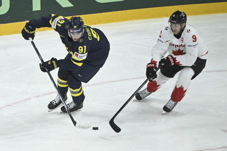 ˇKanadský útočník Nathan MacKinnon sa snaží zobrať puk Švédovi Leovi Carlssonovi v zápase základnej A-skupiny na MS v hokeji 2025. Štokholm (Avicii Arena), 20. máj 2025. Foto: Fredrik Sandberg/TT via AP.