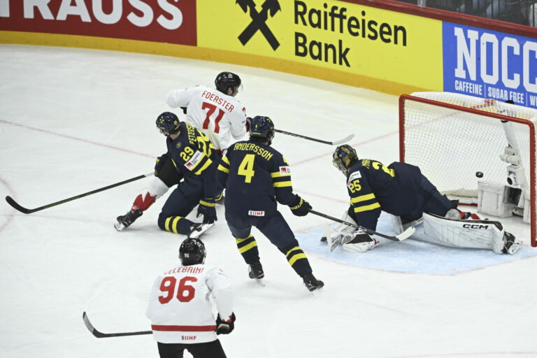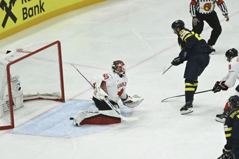 Kanadský útočník Tyson Foerster strieľa gól na 2:1 v zápase proti Švédsku v základnej A-skupine na MS v hokeji 2025. Štokholm (Avicii Arena), 20. máj 2025. Foto: Fredrik Sandberg/TT via AP.