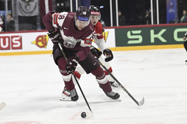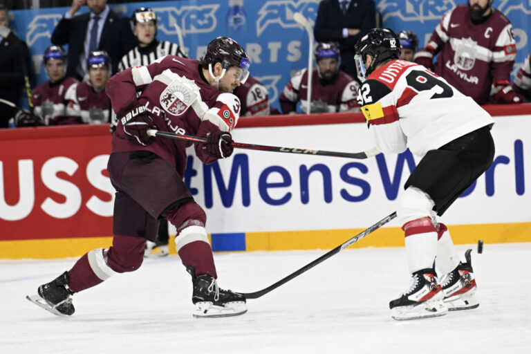 Lotyšský útočník Rodrigo Abols v súboji s Rakúšanmi v zápase základnej A-skupiny na MS v hokeji 2025. Štokholm (Avicii Arena), 20. máj 2025. Foto: Pontus Lundahl/TT News Agency via AP.