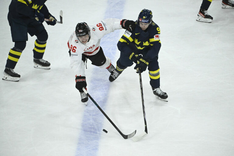 Kanadský útočník Macklin Celebrini v súboji o puk so Švédom Leom Carlssonom počas zápasu základnej A-skupina na MS v hokeji 2025. Štokholm (Avicii Arena), 20. máj 2025. Foto: Fredrik Sandberg/TT via AP.