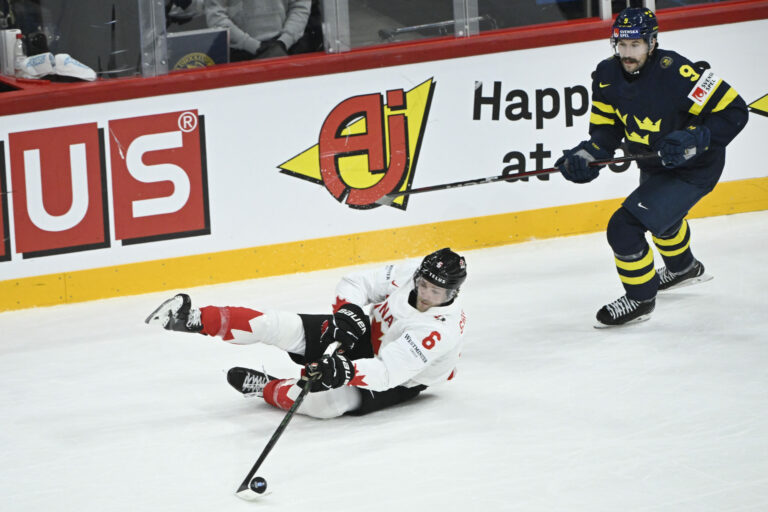 Kanadský obranca Travis Sanheim padá po súboji so švédskym útočníkom Filipom Forsbergom počas zápasu základnej A-skupiny na MS v hokeji 2025. Štokholm (Avicii Arena), 20. máj 2025. Foto: Fredrik Sandberg/TT via AP.