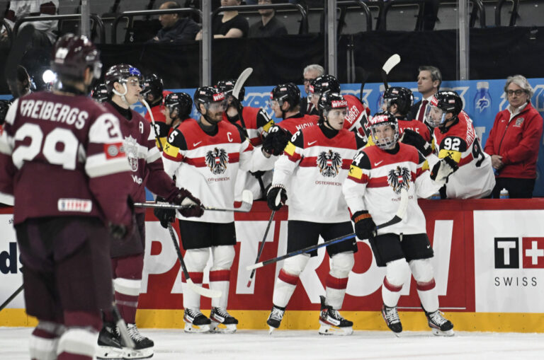 Rakúsky útočník Benjamin Baumgartner sa so spoluhráčmi teší zo svojho gólu na 2:0 v sieti Lotyšska v zápase základnej A-skupiny na MS v hokeji 2025. Štokholm (Avicii Arena), 20. máj 2025. Foto: Pontus Lundahl/TT News Agency via AP.