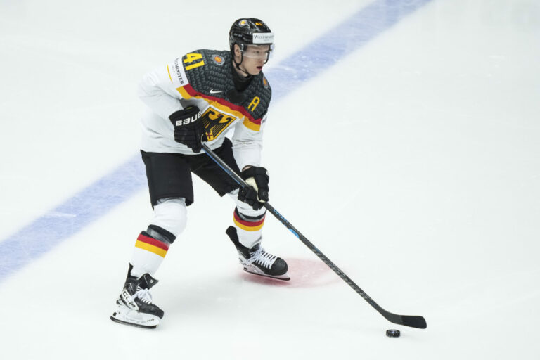Nemecký obranca Jonas Müller počas zápasu proti USA v základnej B-skupine na MS v hokeji 2025. Herning (Jyske Bank Boxen), 17. máj 2025. Foto: Claus Fisker/Ritzau Scanpix via AP.