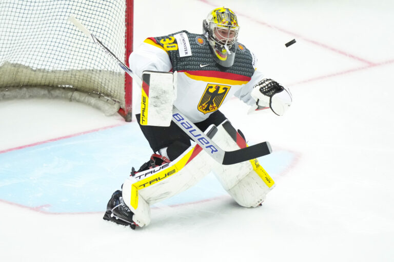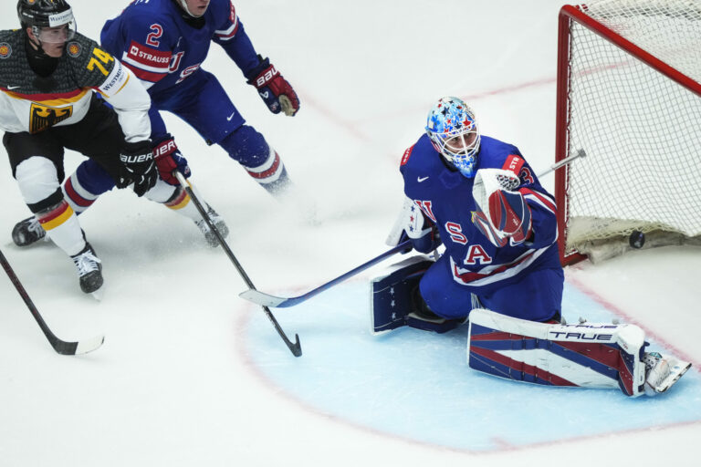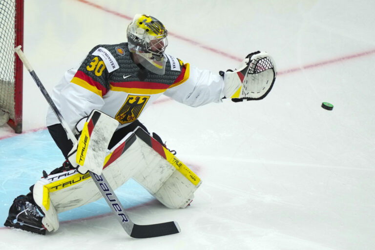 Zákrok nemeckého brankára Philippa Grubauera počas zápasu proti USA v základnej B-skupine na MS v hokeji 2025. Herning (Jyske Bank Boxen), 17. máj 2025. Foto: Claus Fisker/Ritzau Scanpix via AP.