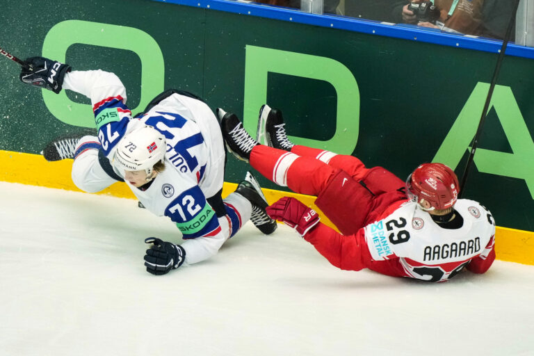 Zrážka Stiana Solberga z Nórska (vľavo) a Mikkela Aagaarda z Dánska počas zápasu základnej B-skupiny na MS v hokeji 2025. Herning (Jyske Bank Boxen), 17. máj 2025. Foto: Claus Fisker/Ritzau Scanpix via AP