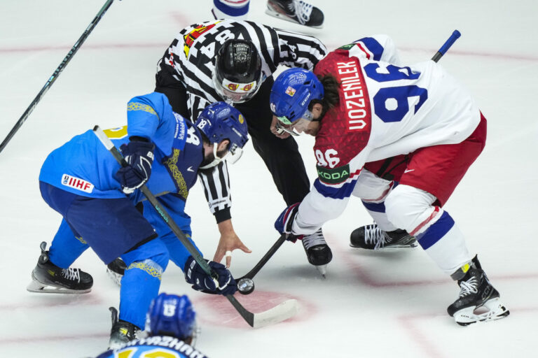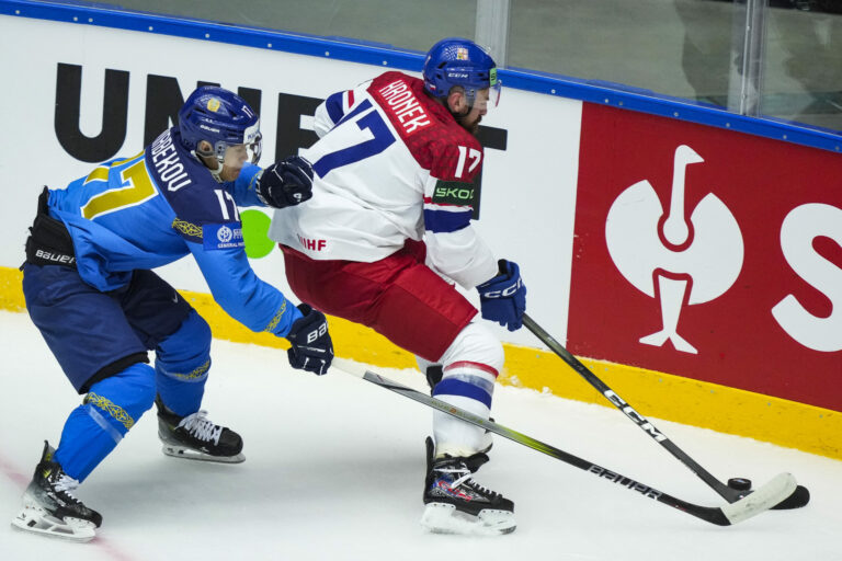Kazach Vladimir Omirbekov a český útočník Daniel Voženílek počas zápasu základnej A-skupiny na MS v hokeji 2025. Herning (Jyske Bank Boxen), 17. máj 2025. Foto: Claus Fisker/Ritzau Scanpix via AP.