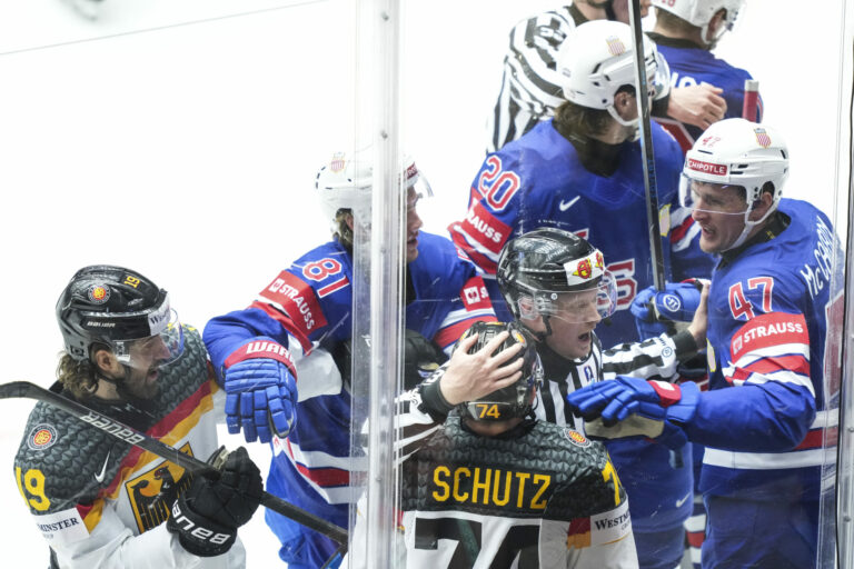 Šarvátka v zápase USA - Nemecko v základnej B-skupine na MS v hokeji 2025. Herning (Jyske Bank Boxen), 17. máj 2025. Foto: Claus Fisker/Ritzau Scanpix via AP.