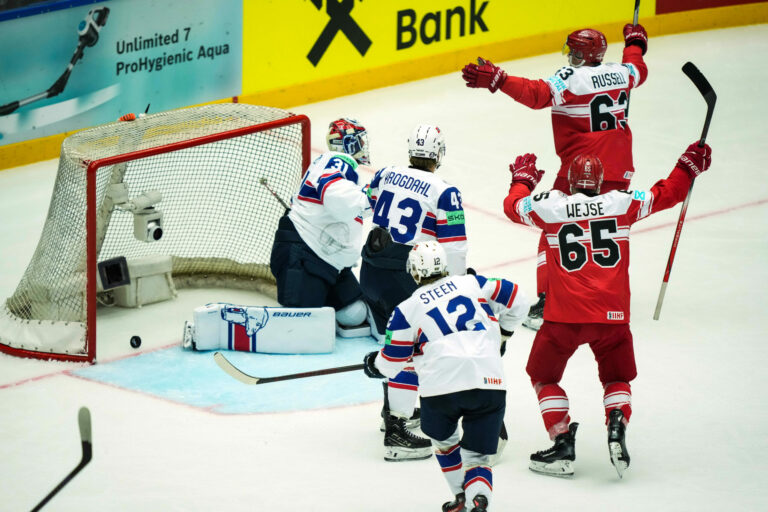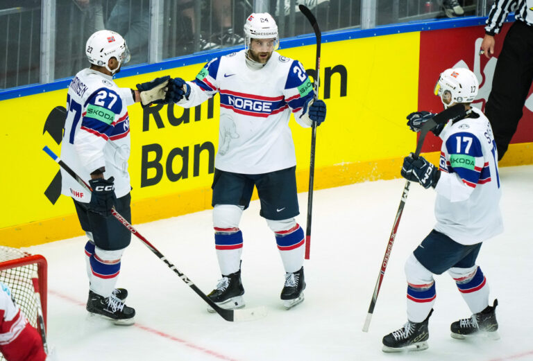 Hráči Nórska sa radujú z gólu proti Dánsku počas zápasu základnej B-skupiny na MS v hokeji 2025. Herning (Jyske Bank Boxen), 17. máj 2025. Foto: Claus Fisker/Ritzau Scanpix via AP