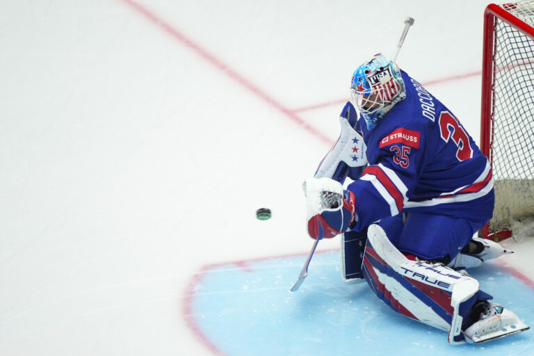 Americký gólman Joey Daccord chytá puk do lapačky počas zápasu proti Nemecku v základnej B-skupine na MS v hokeji 2025. Herning (Jyske Bank Boxen), 17. máj 2025. Foto: Claus Fisker/Ritzau Scanpix via AP.