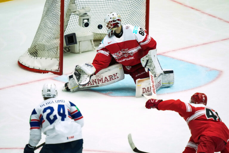 Brankár Dánska Frederik Dichow zasahuje počas zápasu základnej B-skupiny na MS v hokeji 2025 proti Nórsku. Herning (Jyske Bank Boxen), 17. máj 2025. Foto: Claus Fisker/Ritzau Scanpix via AP