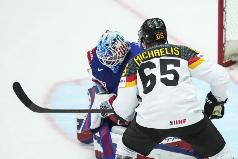 Americký brankár Joey Daccord a jeho zákrok po zakončení nemeckého útočníka Marca Michaelisa počas zápasu základnej B-skupiny na MS v hokeji 2025. Herning (Jyske Bank Boxen), 17. máj 2025. Foto: Claus Fisker/Ritzau Scanpix via AP.
