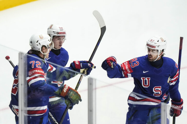 Americký útočník Drew O'Connor so spoluhráčmi oslavuje svoj gól na 3:0 v zápase proti Nemecku v základnej B-skupine na MS v hokeji 2025. Herning (Jyske Bank Boxen), 17. máj 2025. Foto: Claus Fisker/Ritzau Scanpix via AP.