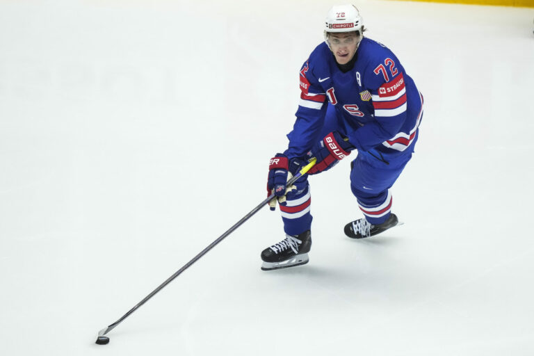 Americký útočník Tage Thompson počas zápasu proti Nemecku v základnej B-skupine na MS v hokeji 2025. Herning (Jyske Bank Boxen), 17. máj 2025. Foto: Claus Fisker/Ritzau Scanpix via AP.