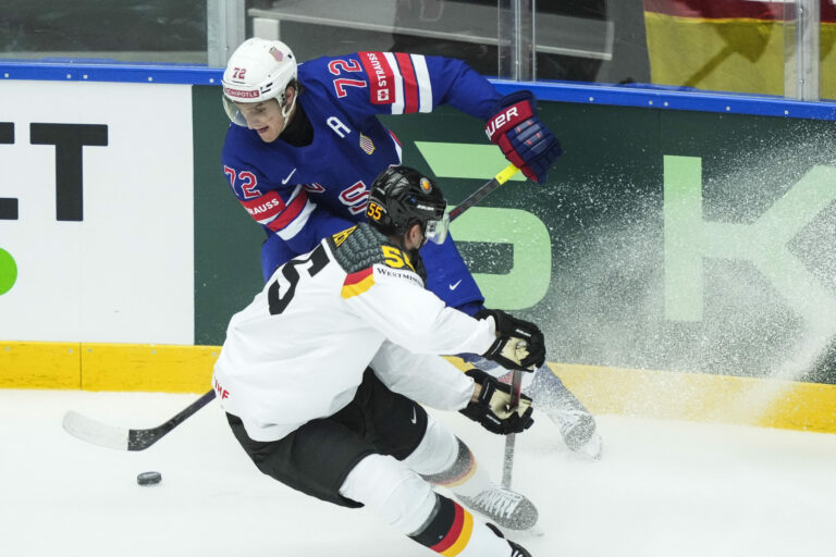 Americký útočník Tage Thompson a nemecký obranca Maksymilian Szuber počas zápasu základnej B-skupiny na MS v hokeji 2025. Herning (Jyske Bank Boxen), 17. máj 2025. Foto: Claus Fisker/Ritzau Scanpix via AP.