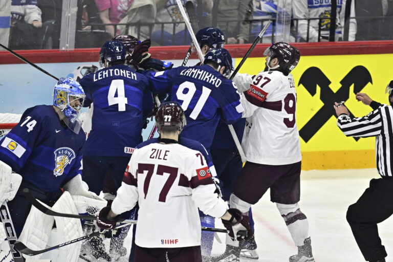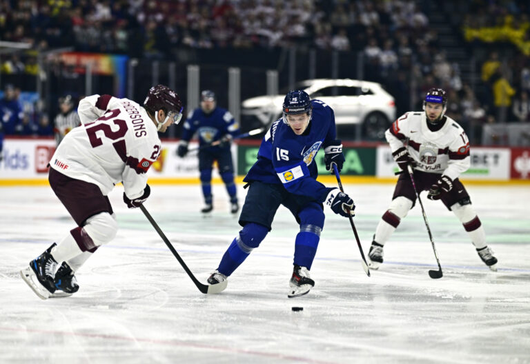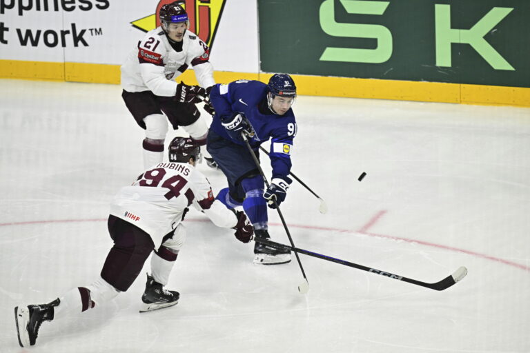 Lotyši Kristians Rubins and Rudolfs Balcers sa snažia zastaviť fínskeho útočníka Juha Lammikka v zápase základnej A-skupine na MS v hokeji 2025. Štokholm (Avicii Arena), 17. máj 2025. Foto: Magnus Lejhall/TT via AP.