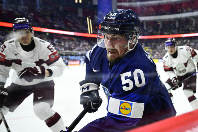 Fínsky obranca Mikael Seppälä počas zápasu proti Lotyšsku v zápase základnej A-skupiny na MS v hokeji 2025. Štokholm (Avicii Arena), 17. máj 2025. Foto: Magnus Lejhall/TT via AP.