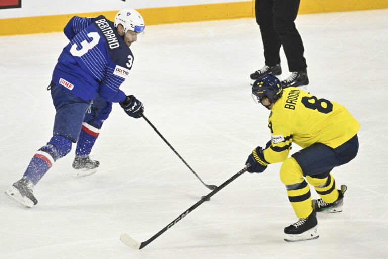 Francúz Charles Bertrand a švédsky obranca Jonas Brodin počas zápasu základnej A-skupiny na MS v hokeji 2025. Štokholm (Avicii Arena), 17. máj 2025. Foto: Anders Wiklund/TT News Agency via AP.