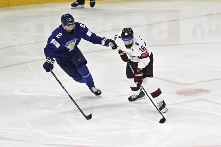 Fín Rasmus Rissanen sa snaží zablokovať strelecký pokus lotyšského útočníka Kasparsa Daugavinša v zápase základnej B-skupiny na MS v hokeji 2025. Štokholm (Avicii Arena), 17. máj 2025. Foto: Magnus Lejhall/TT via AP.
