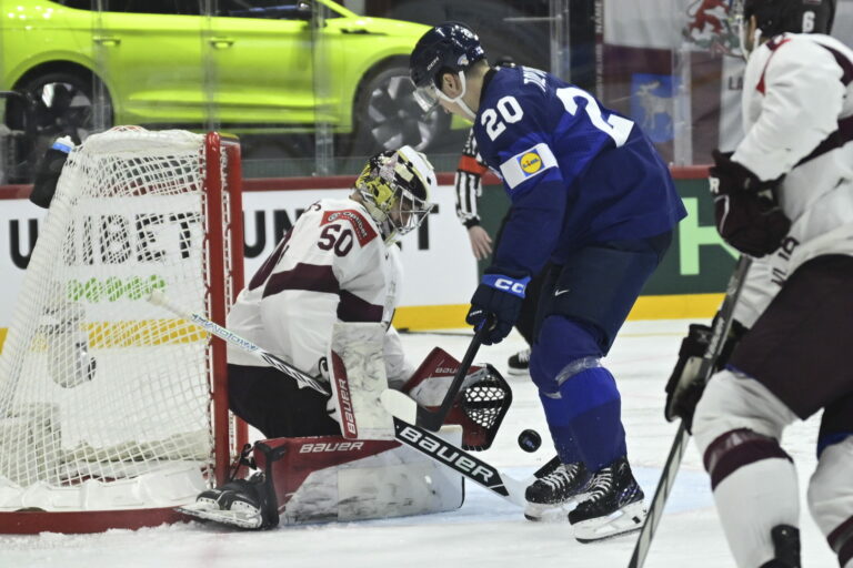 Zákrok lotyšského brankára Kristersa Gudlevskisa po zakončení fínskeho útočníka Harriho Pesonena v zápase základnej A-skupiny na MS v hokeji 2025. Štokholm (Avicii Arena), 17. máj 2025. Foto: Magnus Lejhall/TT via AP.