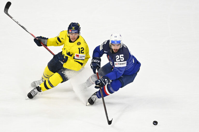 Švédsky útočník Max Friberg a Francúz Nicolas Ritz počas zápasu základnej A-skupiny na MS v hokeji 2025. Štokholm (Avicii Arena), 17. máj 2025. Foto: Anders Wiklund/TT News Agency via AP.