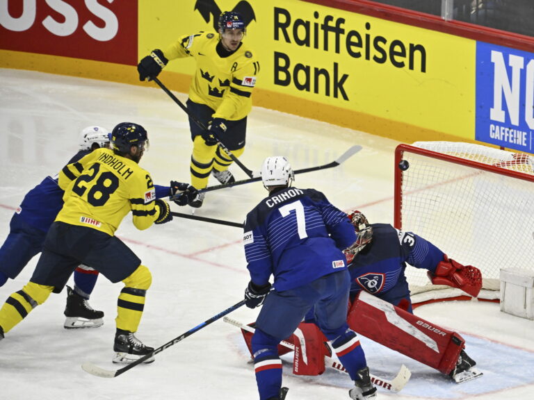 Švédsky útočník Jesper Frödén v súboji pred bránkou Francúzska pri jednom z gólov "troch koruniek" v zápase základnej A-skupiny na MS v hokeji 2025. Štokholm (Avicii Arena), 17. máj 2025. Foto: Anders Wiklund/TT News Agency via AP.