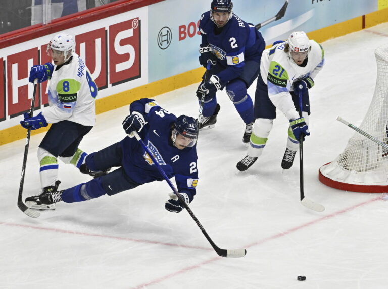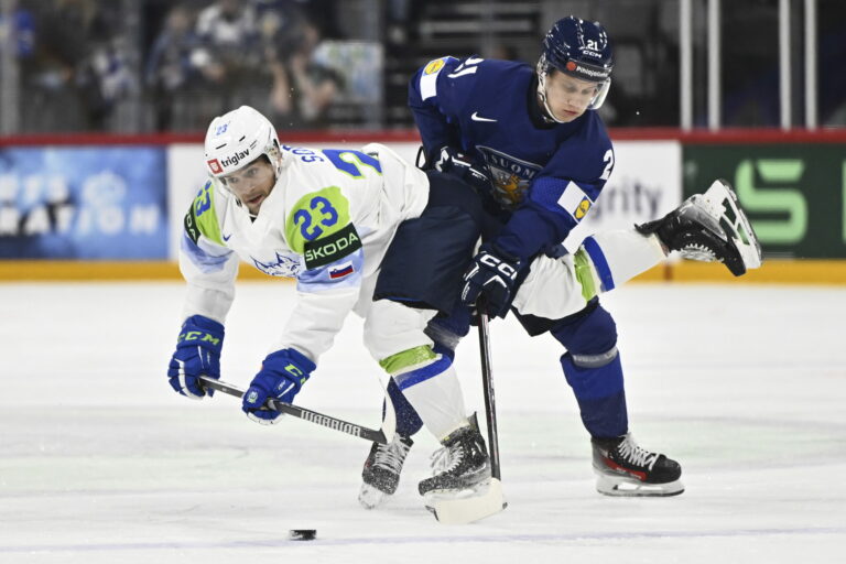 Fínsky útočník Mikael Ruohomaa sa snaží zastaviť Slovinca Bineho Mašića v zápase základnej A-skupiny na MS v hokeji 2025: Štokholm (Avicii Arena), 15. máj 2025. Foto: Anders Wiklund/TT News Agency via AP.